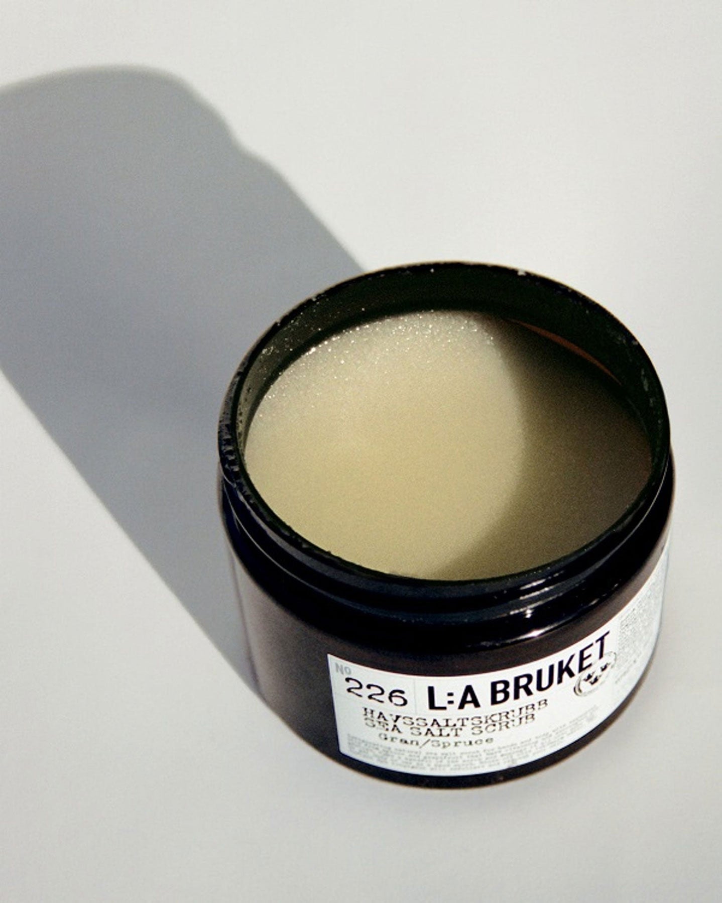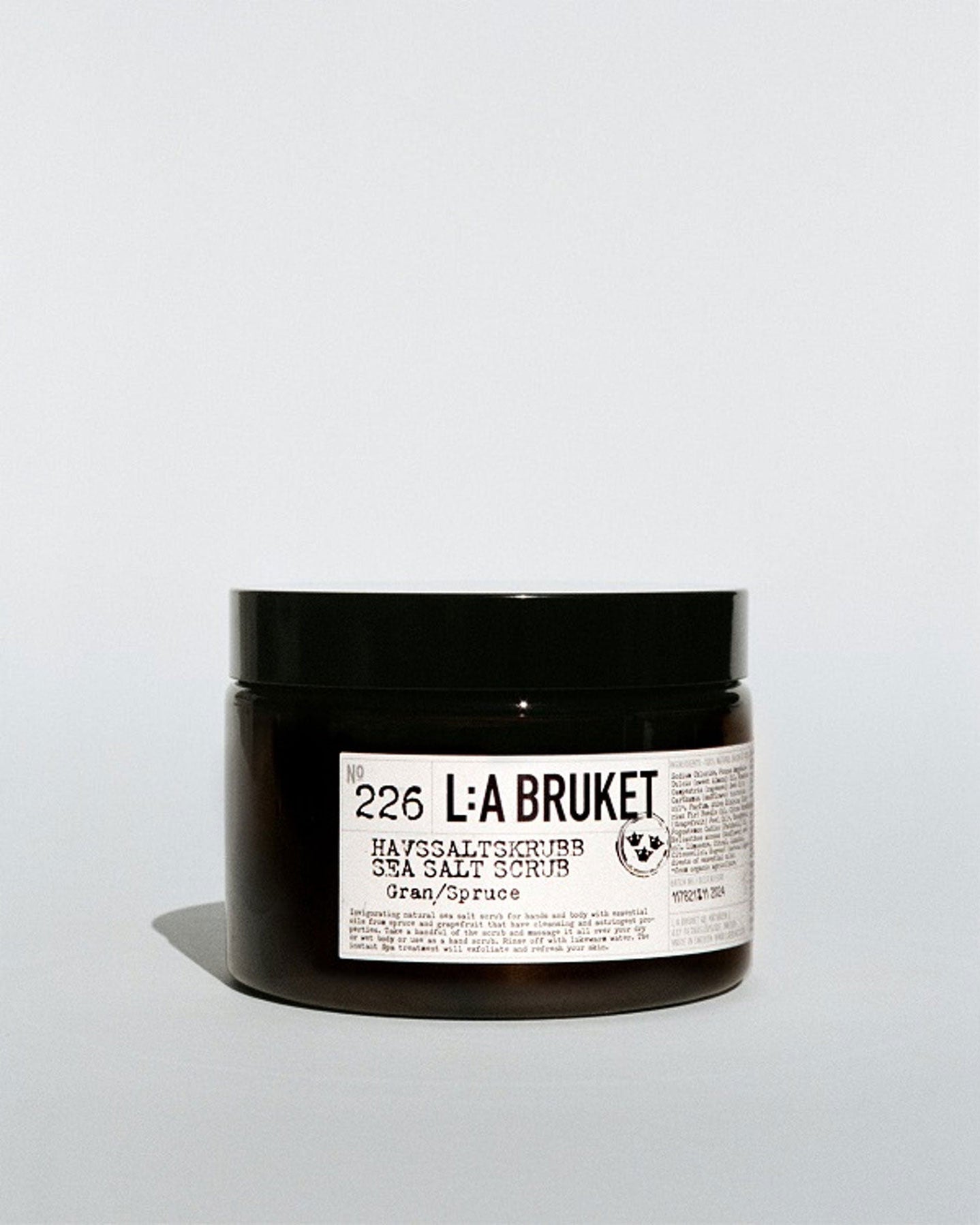 226 Havssaltskrubb Gran/Sprouce är en naturligt baserad kroppskrubb med djuprengörande havssalt och återfuktande gran- och mandelolja, samt en rogivande doft av citrus, gran och örter.